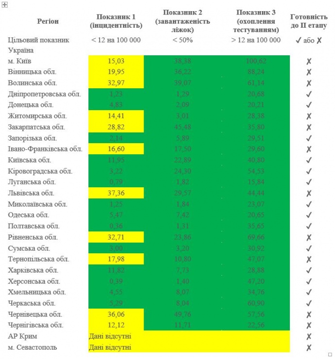 Завантаженість профільних лікарень хворими на COVID-19 і охоплення тестуванням у всіх регіонах відповідає необхідним критеріям.