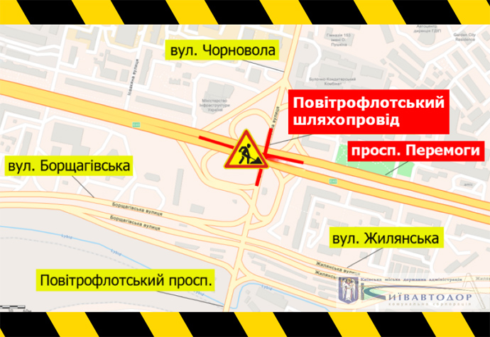 Дослівно: "На Повітрофлотському шляхопроводі розпочинаємо протиаварійні роботи. Триватимуть вони до 19 липня. Під час робіт рух на шляхопроводі буде частково обмежено".