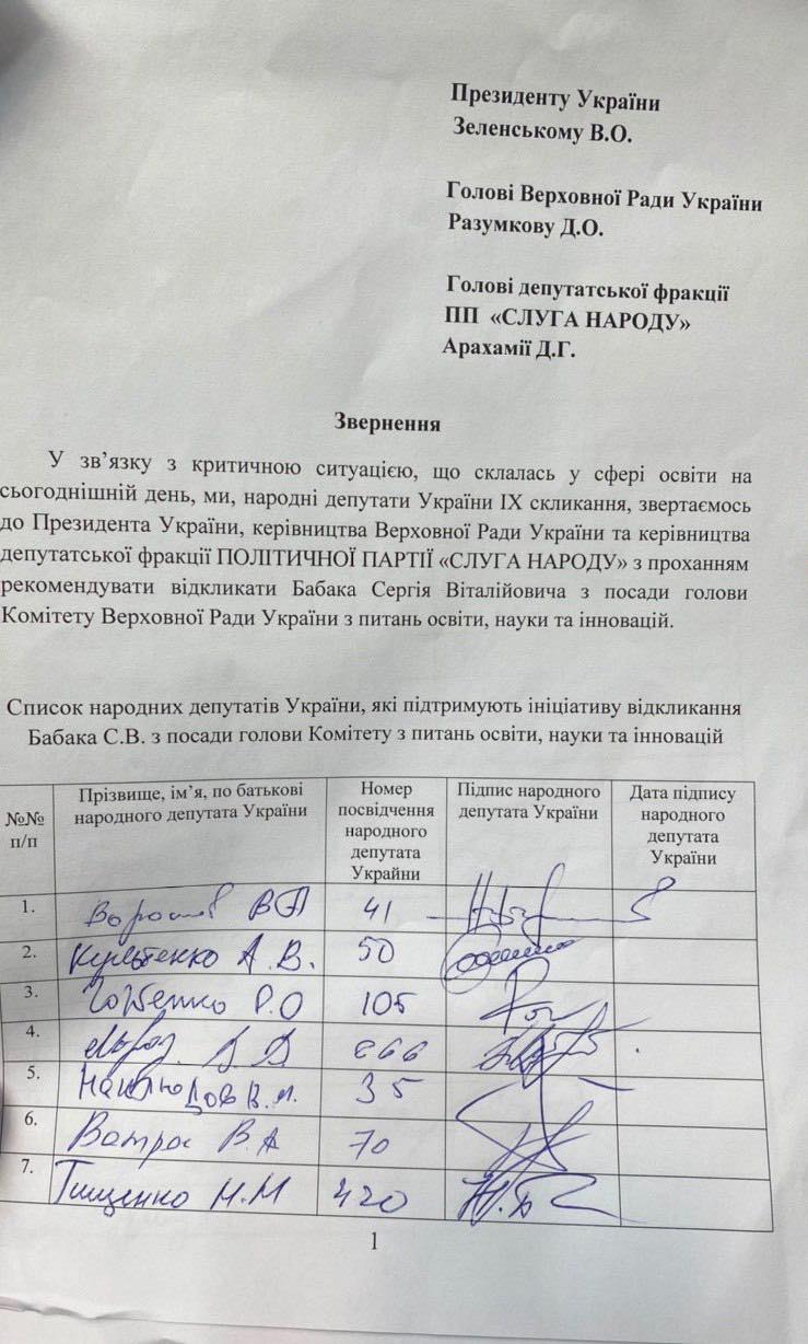 Деталі: Підписи збираються під зверненням до президента, голів ВР та фракції "Слуга народу" з пропозицією відкликати Бабака з посади.