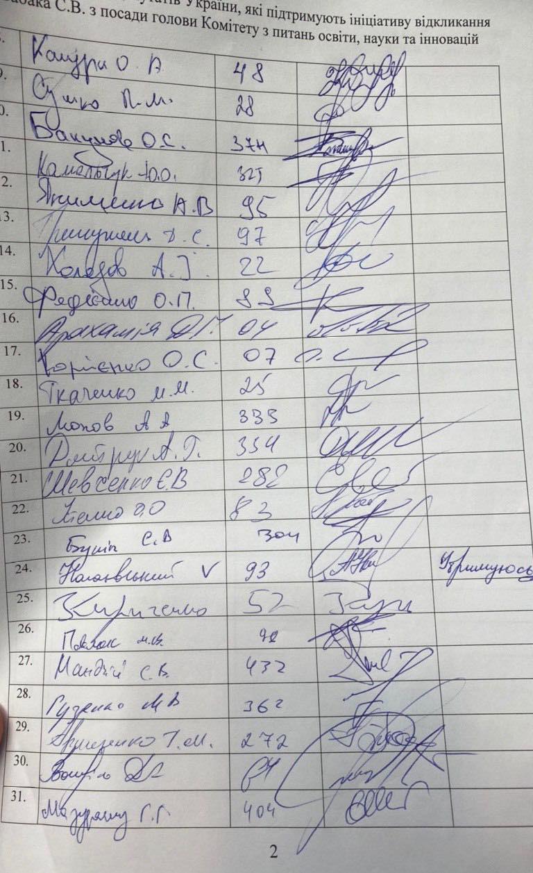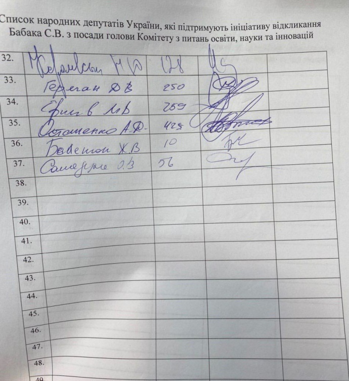 У Верховній Раді почали збір підписів за відставку голови комітету з питань освіти, науки та інновацій Сергія Бабака. 18 червня його комітет не підтримав кандидатуру колишнього "регіонала" Сергія Шкарлета на посаду міністра освіти.