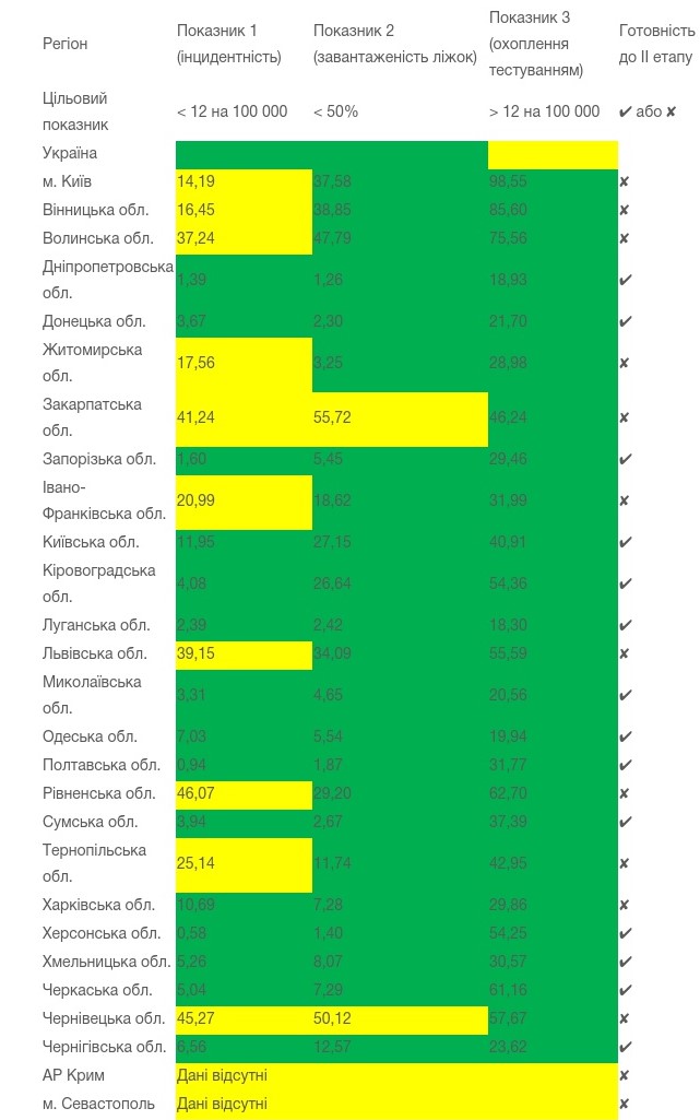 На основі аналізу епідемічної ситуації станом на 21 червня МОЗ констатує, що Київ, а також Вінницька, Волинська, Житомирська, Закарпатська, Львівська, Івано-Франківська, Рівненська, Тернопільська та Чернівецька області не готові до послаблення карантину.