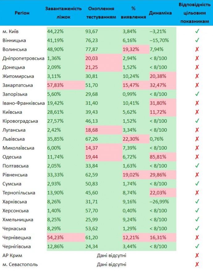 - середня кількість тестувань методом ПЛР і ІФА становить менше 24 на 100 тис. населення протягом останніх семи днів;