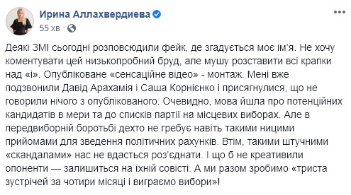 Пряма мова Аллахвердієвої: "Деякі ЗМІ сьогодні розповсюдили фейк, де згадується моє ім’я. Не хочу коментувати цей низькопробний бруд, але мушу розставити всі крапки над "і". Опубліковане "сенсаційне відео" – монтаж.