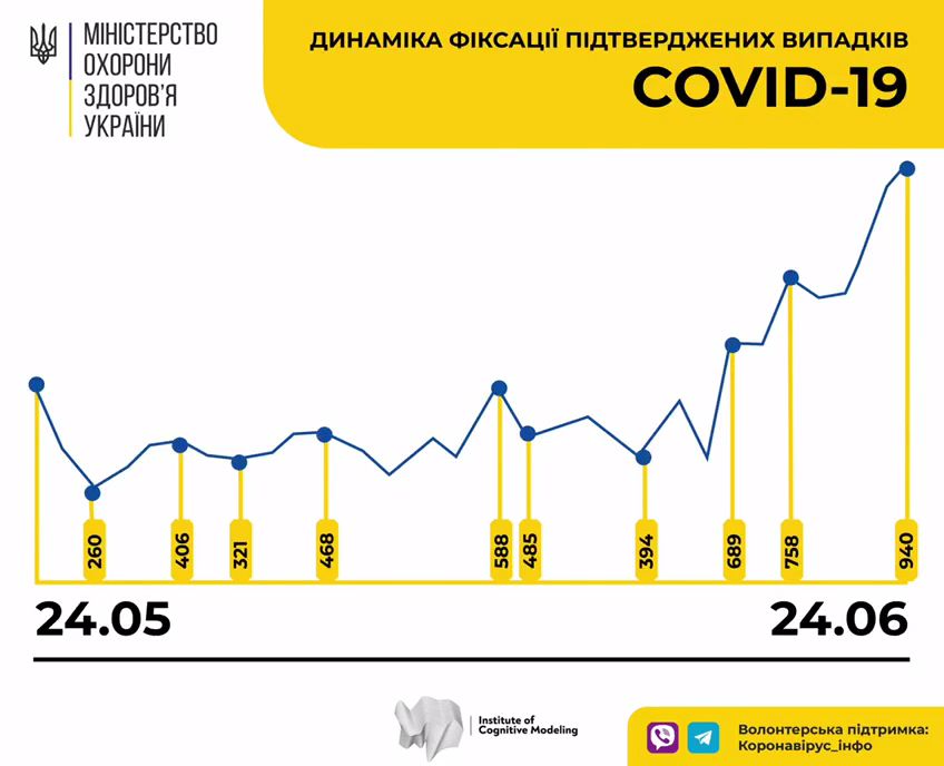 За добу 23 червня діагноз COVID-19 в Україні підтвердили 940 особам, 16 хворих померли, 453 одужали.