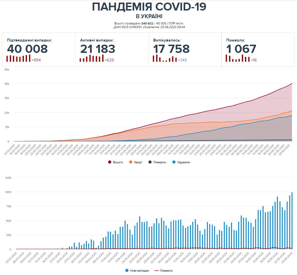 За добу 24 червня в Україні коронавірусну хворобу COVID-19 підтвердили у 994 осіб, 16 хворих померли, 349 осіб одужали.