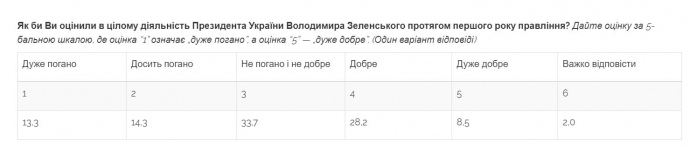 Дослівно: "Загалом 37% опитаних оцінили діяльність В.Зеленського протягом першого року перебування при владі "добре" або "дуже добре". Відносна більшість, 34% опитаних оцінили діяльність В.Зеленського на "3" ("не погано і не добре"), а 28% — "досить погано" або "дуже погано".
