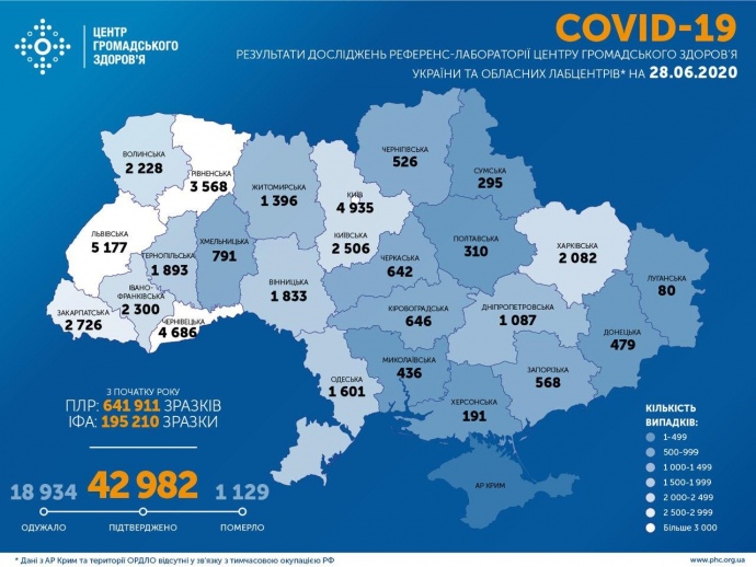 28 червня станом на 9:00 в Україні 42 982 лабораторно підтверджені випадки COVID-19, з них 1 129 летальних, 18 934 пацієнти одужали. Загалом проведено 641 911 тестувань методом ПЛР.