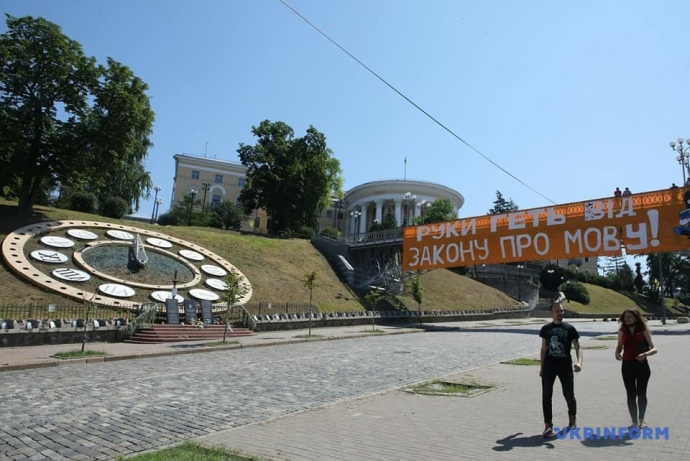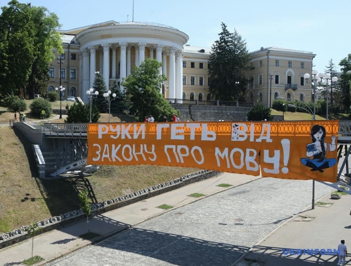 У День Конституції України у Києві на мосту над Алеєю Героїв Небесної Сотні активісти спільноти "Мова об'єднує" вивісили 25-метровий банер "Руки геть від закону про мову!".