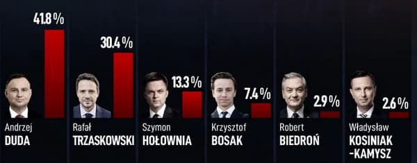 Згдіно екзит-полам, за чинного президента Анджея Дуду віддали голоси 41,8% виборців. Натомість, за опозиціонера Тшасковського – 30,4%.