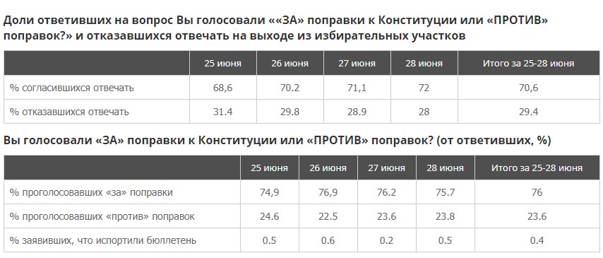 На виході з виборчої дільниці інтерв'юери пропонували пройти анонімне опитування. Ставилося запитання про те, як проголосував респондент – "за" або "проти" поправок до Конституції РФ.