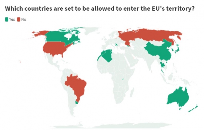 Спершу у четвер "зелений" список містив 54 країни, у тому числі Україну. Тепер, за інформацією агентства, їх 15: Чорногорія, Сербія, Грузія, Канада, Алжир, Австралія, Японія, Марокко, Нова Зеландія, Руанда, Південна Корея, Таїланд, Туніс, Уругвай, та – за умови взаємного дозволу – Китай.