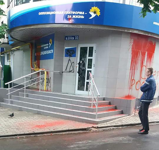 Дослівно: "Сьогодні, 29 червня, приблизно о 2 годині ночі в Краматорську скоєно напад на регіональну громадську приймальню політичної партії "Опозиційна платформа – За життя". За словами керівника приймальні Світлани Фоміної, люди в масках пошкодили вхідні двері, а також за допомогою балонів з фарбою розмалювали офіс написами".