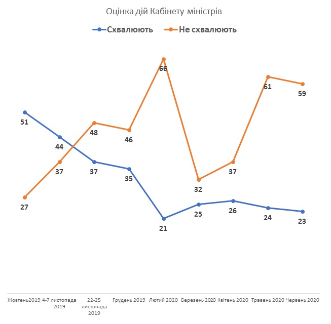 Деталі: При цьому 23% опитаних у червні схвалюють дії Кабінету міністрів (24% в травні); 59% – не схвалюють (61% в травні).