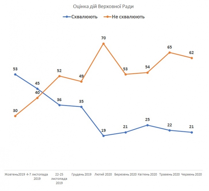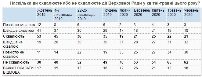 Дії Верховної Ради схвалюють 21% українців (22% в травні); 62% – не схвалюють (65% в травні). Баланс оцінок є від’ємним і становить мінус 41 відсоткових пунктів.