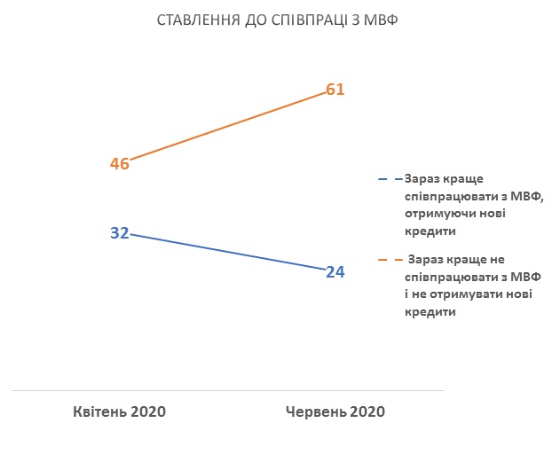 61% респондентів у червні сказали, що зараз краще не співпрацювати з МВФ і не отримувати нові кредити. Порівняно з квітнем, частка людей, які так вважать, збільшилась на 15% (с 46% до 61%).