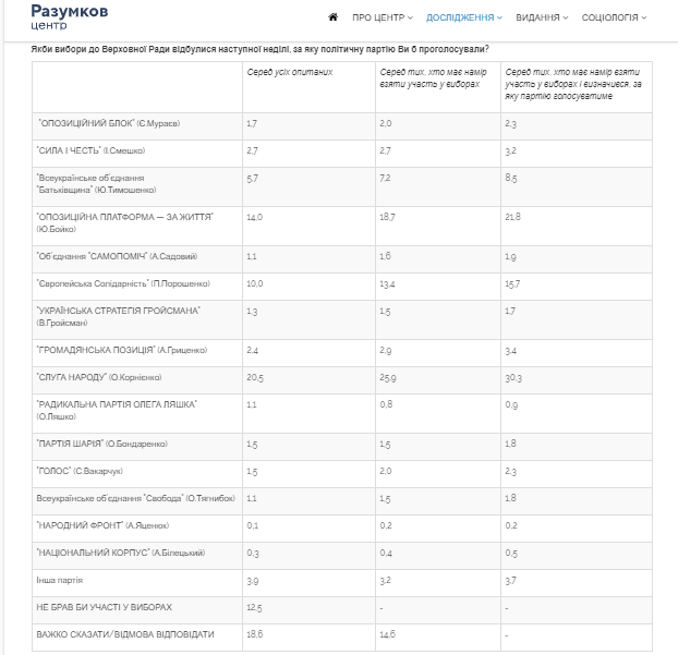 "Громадянську позицію" Анаталія Гриценка підтримують 3% тих респондентів, які визначилися, за політичну партію "Сила і честь" Ігоря Смешка — 3%, "Опозиційний блок" —2%, політичну партію "Голос" — 2%, партію Шарія — 2%, за "Об’єднання "Самопоміч" —2%, за партію "Українська стратегія Гройсмана" —2%, ВО "Свобода" —2%, за "Радикальну партію Олега Ляшка" — відповідно 1%, за кожну з інших партій — менше 1% респондентів.