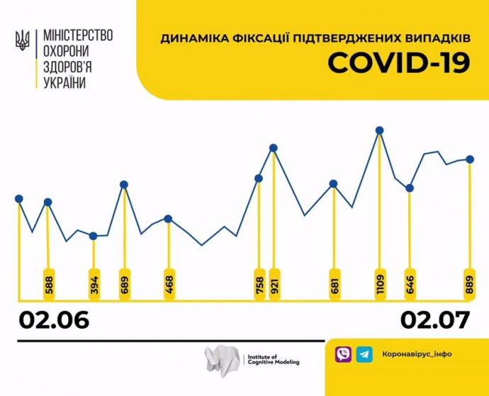 За добу 1 липня в Україні COVID-19 діагностували у 889 осіб, 12 хворих померли, 505 одужали від коронавірусу.