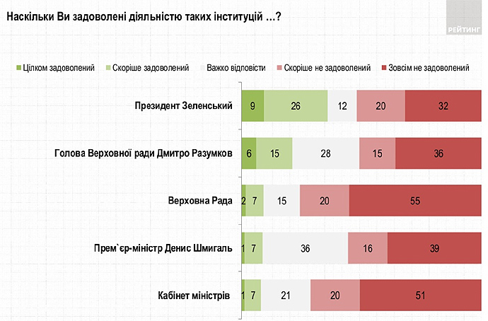 Водночас роботою голови Верховної ради Дмитра Разумкова задоволені 21%, не задоволені – 51%, не змогли оцінити його роботу 28%.