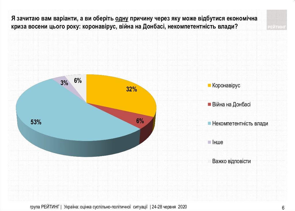 При цьому 53% вважають, що економічна криза восени цього року може відбутися через некомпетентність влади, 32% – що причиною може стати коронавірус, 6% – що війна на Донбасі може призвести до цього.