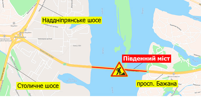 З 3 липня до 30 серпня на Південному мосту у Києві частково обмежать рух у зв’язку з ремонтом дорожнього покриття.