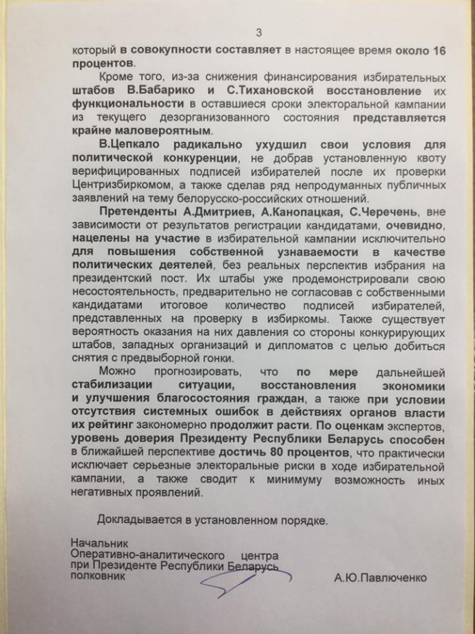 Глава Білоруської Спілки Журналістів Андрій Кривошеєв опублікував результати соцопитування, яке провів Оперативно-аналітичний центр при президентові Білорусі, щодо рейтингу президента Олександра Лукашенка.