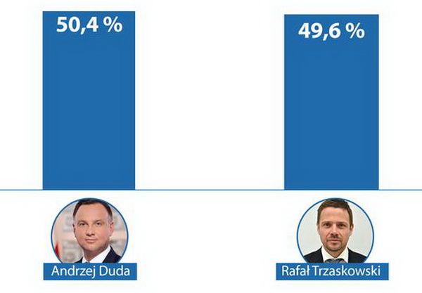 Як повідомляє "Європейська правда" із посиланням на Wyborcza, екзитполи, проведені службою Ipsos дають Дуді 50,4% підтримки виборців, тоді як його опоненту меру Варшави Рафалу Тшасковському – 49,6%.