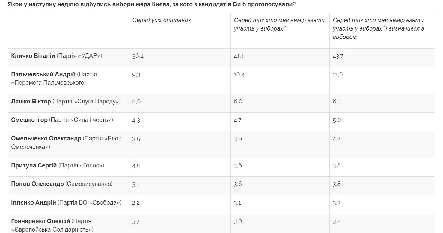 Дослівно: "Якби найближчим часом проходили вибори Київського міського голови, найбільшу підтримку виборців на них отримав би чинний мер Віталій Кличко — за нього готові проголосувати 36% усіх опитаних, або 44% тих, хто готовий взяти участь у виборах і визначився, за кого з кандидатів голосуватиме.