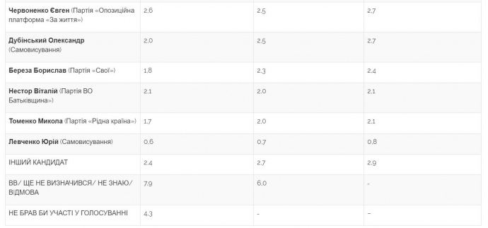 Далі у рейтингу йдуть, зокрема, представник партії "Голос" Сергій Притула (відповідно 4% і 4%) та "Євросолідарності" Олексій Гончаренко (відповідно 4% і 3%), Андрій Іллєнко "Свобода" (відповідно 2% і 3%).