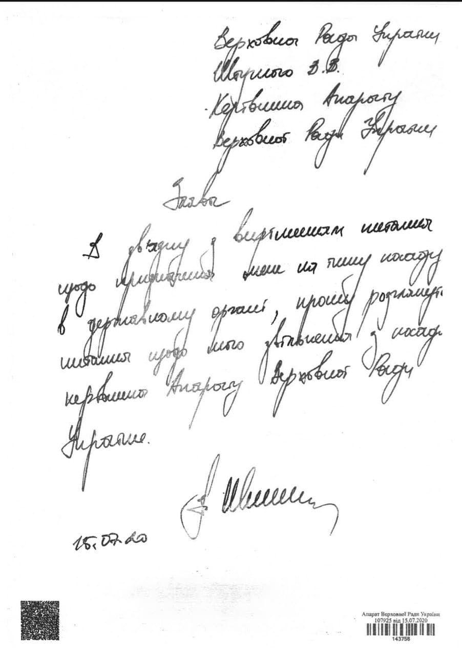 Деталі: Копію самої заяви опублікував в Telegram народний депутат від "Слуги народу" Олександр Качура.