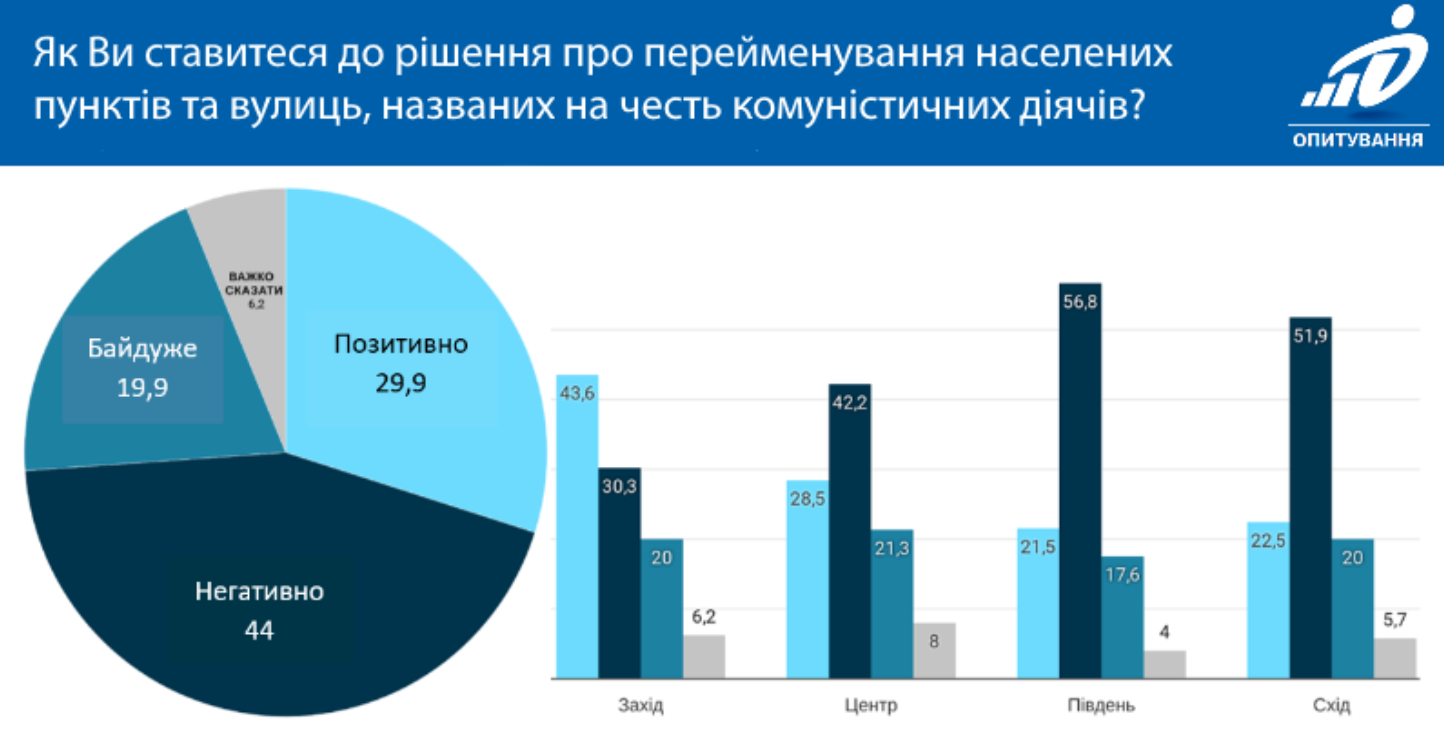 Позитивне ставлення до перейменування топонімів переважає тільки у Західному регіоні (44% "за" і 30% "проти"), на Сході та Півдні близько половини громадян ставляться до перейменування негативно.