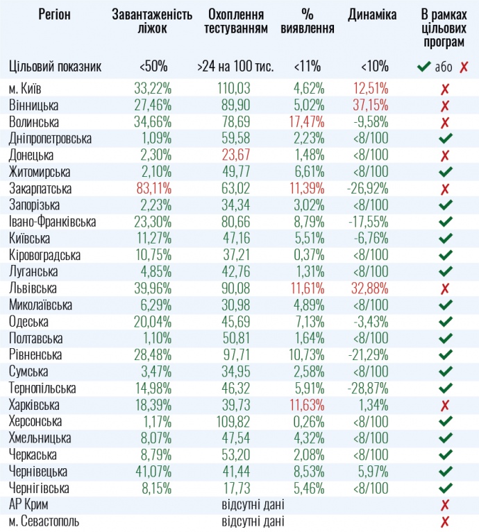 Для того, щоб пом'якшити карантинні обмеження, області повинні відповідати чотирьом цільовим показникам. Заповненість ліжко-місць у лікарнях не повинна перевищувати 50%, відсоток виявлення нових випадків інфекції – 11%, динаміка приросту – не більше 10%. Крім того, за добу в регіоні мають провести щонайменше 24 тестування на 100 тисяч населення.