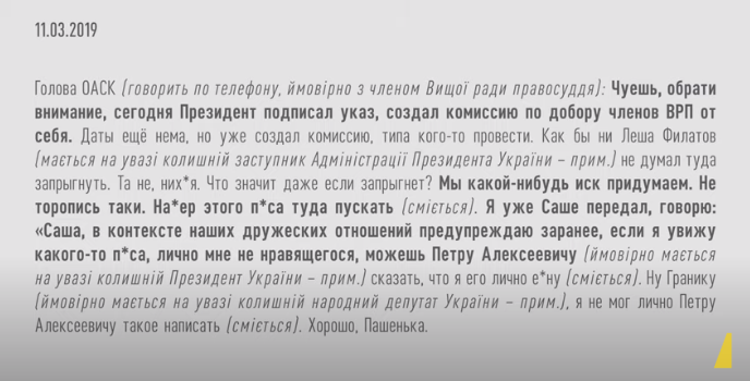 Згідно з телефонною розмовою, яку опублікувало Бюро, Вовк розповідав, що через ймовірно екснардепа Олександра Грановського переказував умови ймовірно п’ятому президенту Петру Порошенку щодо призначень у Вищу раду правосуддя: