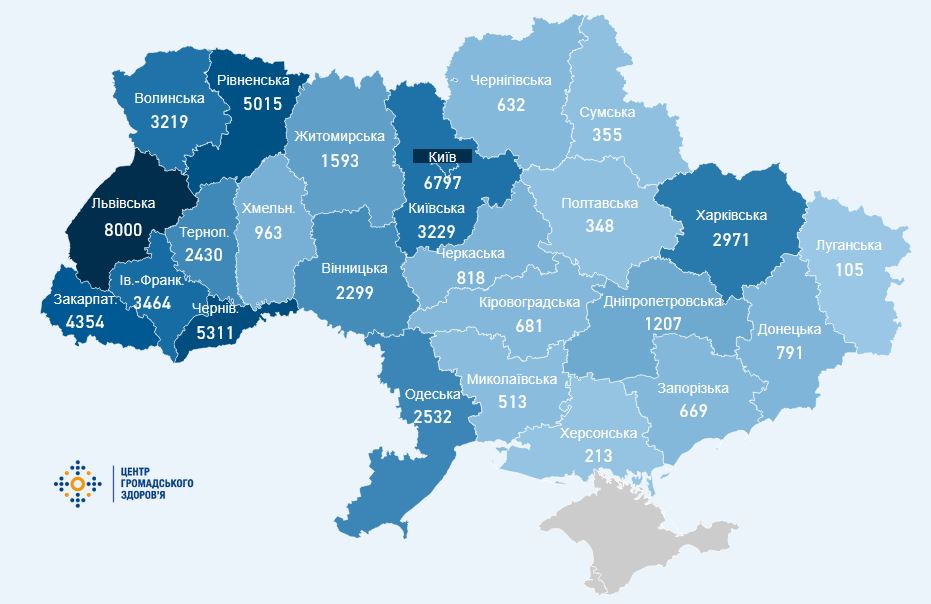 Серед регіонів України лідером по кількості заражень залишається Львівщина, там за минулу добу виявили 109 нових випадків Covid-19 та зафіксували одну смерть.