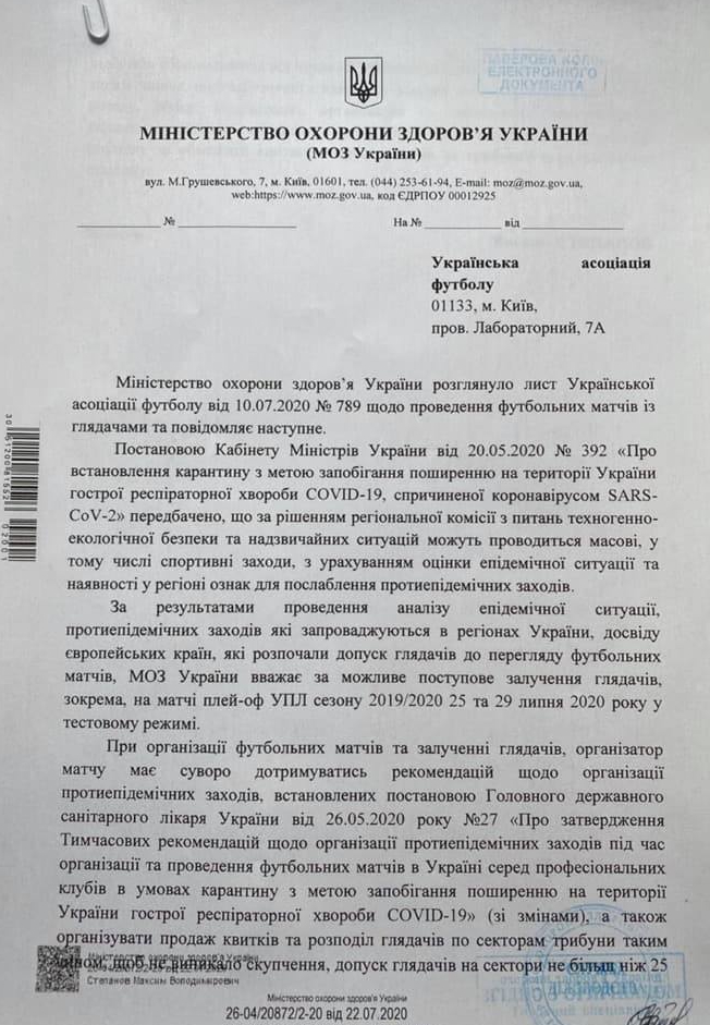 Дослівно МОЗ: "За результатами проведення аналізу епідемічної ситуації, протиепідемічних ситуацій, які запроваджуються в регіонах України, досвіду європейських країн, які розпочали доступ глядачів до перегляду футбольних матчів, МОЗ України вважає за можливе поступове залучення глядачів зокрема на матчі плей-оф УПЛ сезону 2019/20 років 25 та 29 липня у тестовому режимі".
