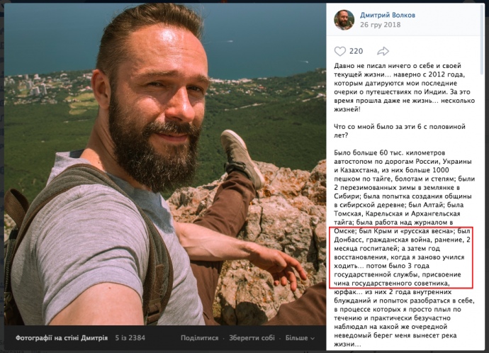 Так, Дмитро Волков із Москви, чия дата народження співпадає з датою народження підозрюваного, самостійно писав на власній сторінці, що був у Криму під час "руской вєсни" та на війні на Донбасі, яку він називає "громадянською". Волков стверджує, що отримав на війні поранення, 2 тижні був у госпіталі. Згодом він пішов на державну службу і отримав чин державного радника.