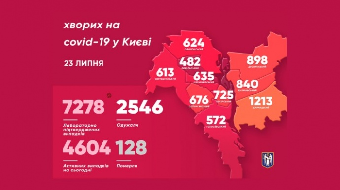 Найбільшу кількість випадків захворювання 22 липня виявили в Дарницькому районі — 20, у Деснянському — 16, у Печерському та Солом‘янському районах — по 13 випадків.