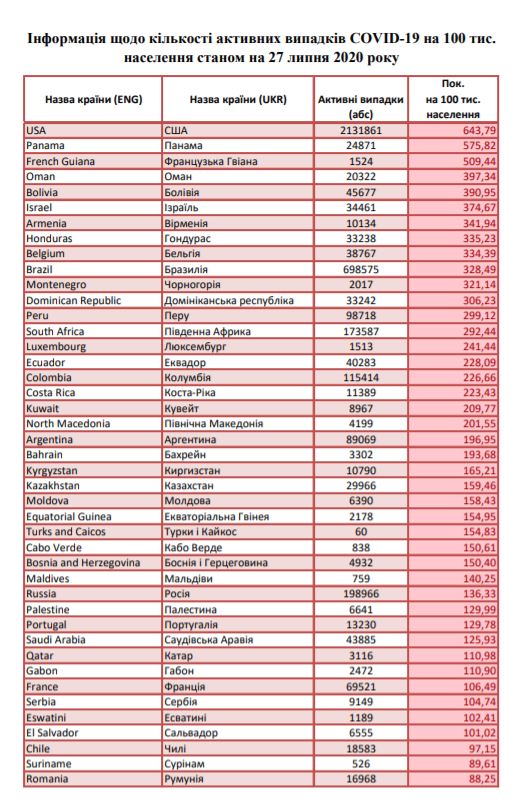 Деталі: Інформацію в МОЗ підготували і опублікували опираючись на дані щодо кількості активних випадків COVID-19 на 100 тис. населення станом на 27 липня 2020 року.