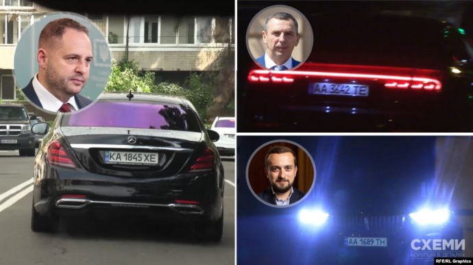 Також "Схеми" з’ясували, що керівник офісу президента Андрій Єрмак, його заступник Кирило Тимошенко, а також перший помічник президента Сергій Шефір пересуваються на автомобілях із так званими "номерами прикриття", які не відображаються в базі Національної поліції. Це унеможливлює нарахування їм штрафів за порушення правил дорожнього руху. При цьому їхні посади не належать до таких, яким передбачена державна охорона (а значить, і заходи "шифрування").