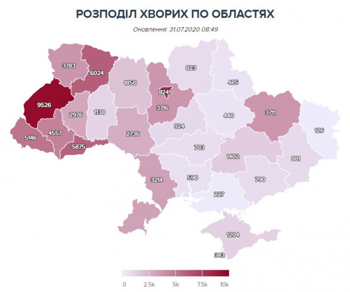 Загалом за час пандемії в Україні було виявлено 69 884 осіб із коронавірусом, із них 38 752 одужали, а 1 693 – померли. Станом на 31 липня від COVID-19 лікуються 29 439 осіб.
