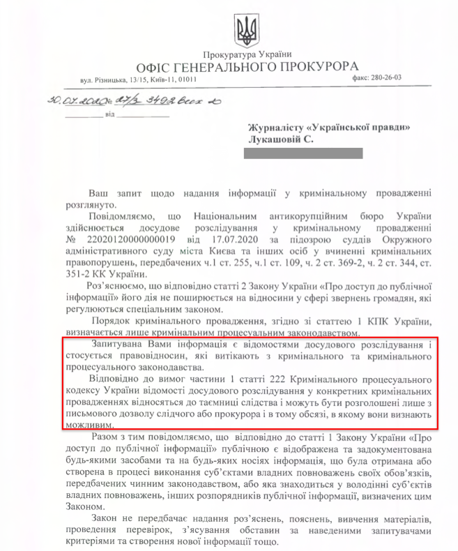 По-друге, в Офісі генпрокурора сказали, що "закон не передбачає надання роз’яснень" у відповіді на запит, публічна інформація "повинна бути заздалегідь готовим, зафіксованим продуктом", тому відповісти на питання УП "немає можливості".
