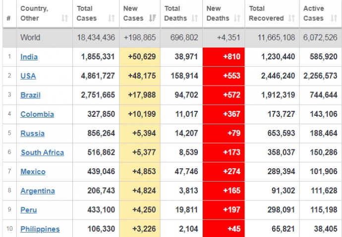 - У світі вже понад 18 мільйонів діагностованих випадків COVID-19. Померло понад 690 тисяч пацієнтів.