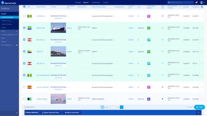 З інструменту MarineTraffic відомо, що від вибуху могли постраждали 5 суден. Серед них два, які прибули з України - MERO STAR та RAOUF H.