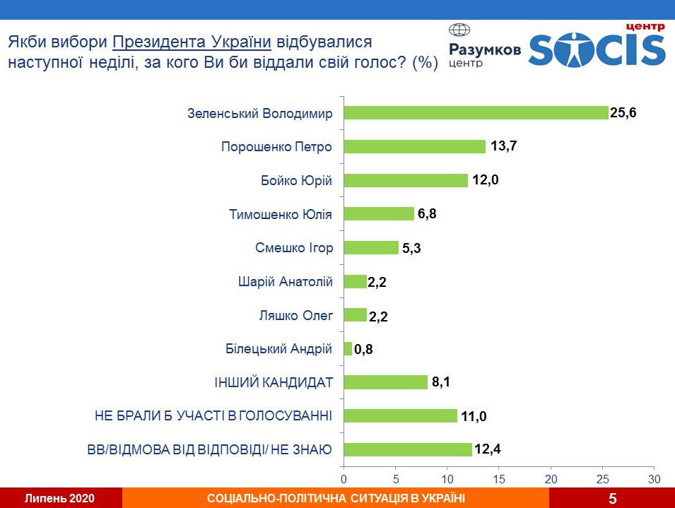 Якби зараз проходив перший тур виборів, 26% українців проголосували б за Зеленського і 14% - за Порошенка. Далі йдуть Юрій Бойко, Юлія Тимошенко та інші.
