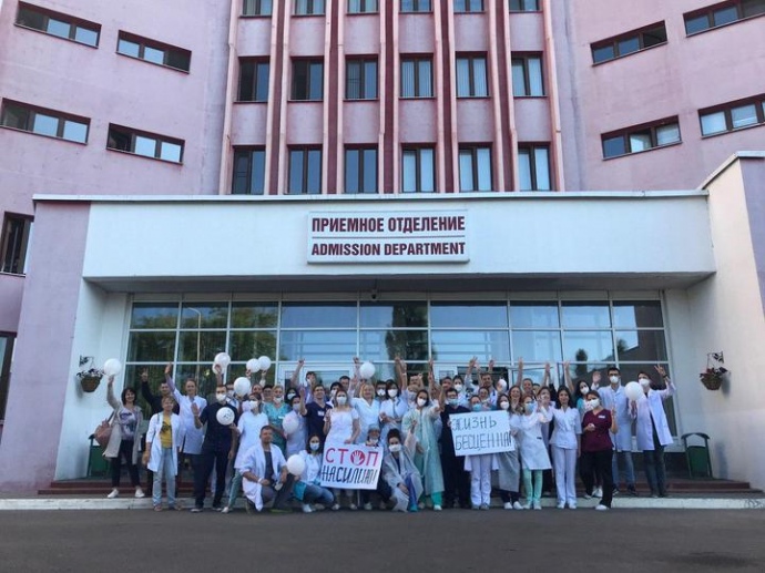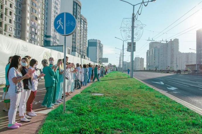 О 8 ранку на акцію солідарності вийшли медики 10-ї міської клінічної лікарні Мінська. За їх словами, вони будуть виходити в цей час кожен день і будуть робити це доти, доки всіх білорусів та їхніх колег не звільнять, перед ними не вибачаться і не виплатять компенсації.