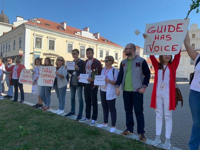 У Мінську на площі Свободи протестують близько 70 гідів. Вони тримають плакати: "Мы казалi турыстам, што Беларусь мiрная", "Гiды супраць гвалту".