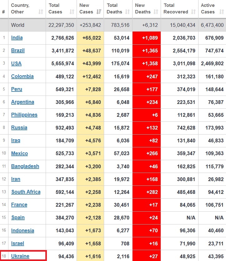 Станом на 18 серпня у світі зафіксовано 22,3 мільйона випадків зараження, з них 252 тисячі тільки за минулу добу.