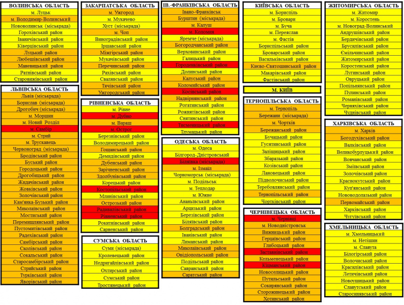 Деталі: До червоної зони буде віднесено: місто Коломия, Городенківський, Косівський та Тисменицький райони Івано-Франківської області; місто Самбір Львівської області; місто Біляївка Одеської області; міста Дубно та Острог, Костопільський, Радивилівський та Рівненський район Рівненської області; місто Чернівці, Заставнівський та Кіцманський район Чернівецької області.