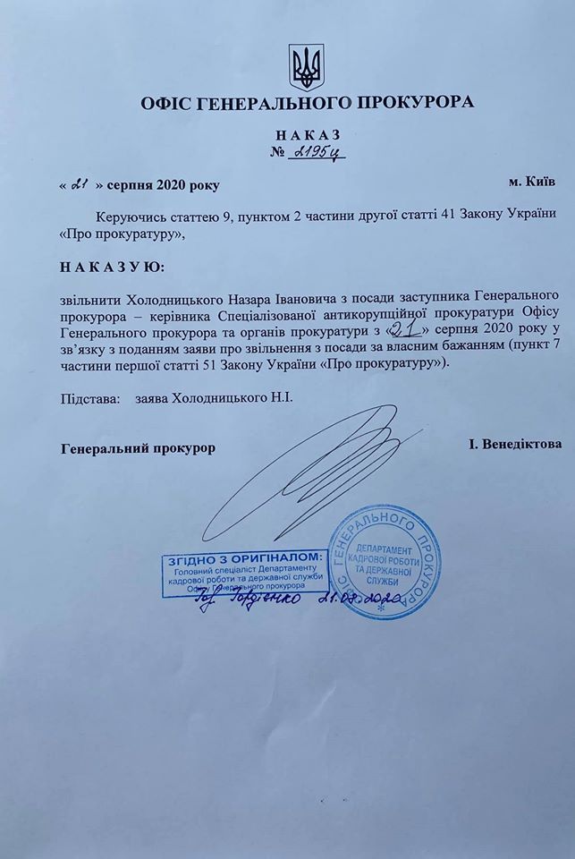 Згодом Холодницький опублікував у Facebook наказ про своє звільнення.