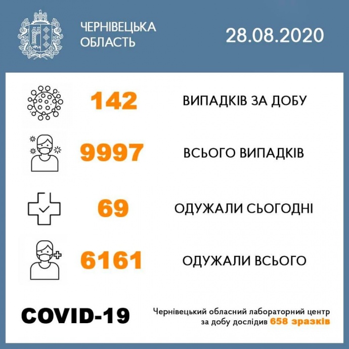 Станом на 28 серпня, загальна чисельність інфікованих коронавірусом людей в Чернівецькій області складає 9997.