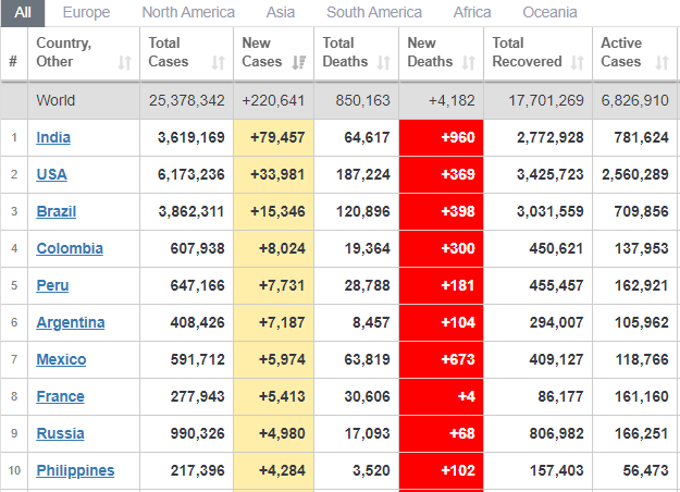 Загалом у світі зафіксували 25,3 мільйони випадків інфікування. Наразі вилікувались 17,7 мільйонів, померли – 850 тисяч. Активними залишаються 6,8 мільйонів випадків.